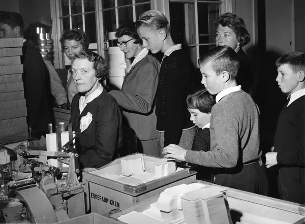 Omvisning i fabrikken. Familiedag hos Tiedemanns Tobaksfabrik i Stensberggate 1959.