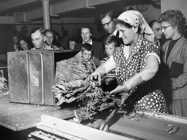 Omvisning i fabrikken. Familiedag hos Tiedemanns Tobaksfabrik i Stensberggate 1959.