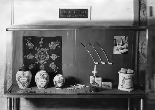 Utstilling ved Kunstindustrimuseet 1959. Montre med utstilling av piper, tobakk og gjenstander/rekvisitt fra Tiedemann.