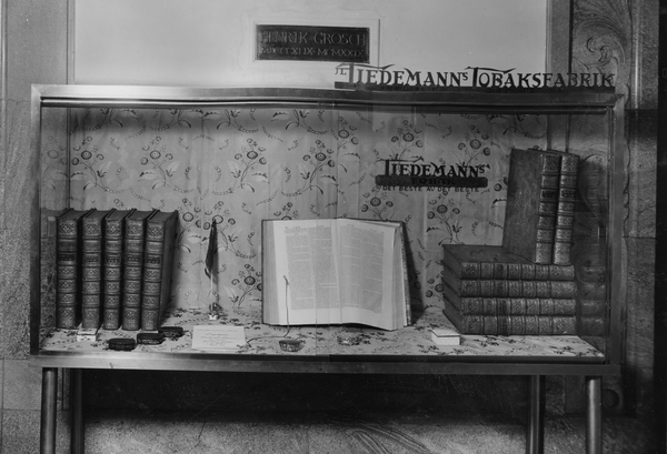 Utstilling ved Kunstindustrimuseet 1952 med temaet "Hvad verdens eldste leksikon sier om tobakk" (påskrift album). Montre med utstilling av tobakk, leksikon og gjenstander/rekvisitt fra Tiedemann.