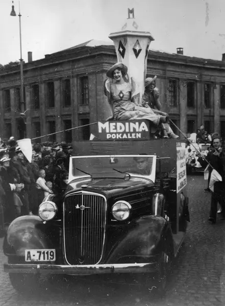 Oslodagen 1/6 1935. Reklame for Medina sigaretter. To kvinner i kjoler pyntet med logotypen for Medina sigaretter sitter på taket til en bil sammen med en stor Medinapokale.