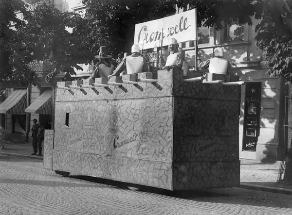 Kjøretøy fra et reklameopptog høsten 1926 med flere menn utkledde til riddere. Reklame for Cromwell sigaretter.