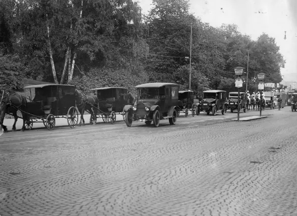 Biler, hester og vogner i et reklameopptog høsten 1926 med flere utkledde menn. Reklame for Kef og Sultan sigaretter.