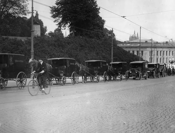Biler, hester og vogner i et reklameopptog høsten 1926 med flere utkledde menn. Reklame for Kef og Sultan sigaretter.
