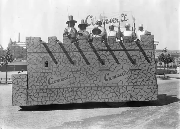 Kjøretøy fra et reklameopptog høsten 1926 med flere menn utkledde til riddere. Reklame for Cromwell sigaretter.