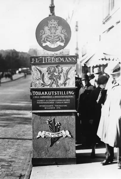 Reklameskilt for Tiedemanns tobakkutstilling i anledning av bedriftens 150-års jubileum.