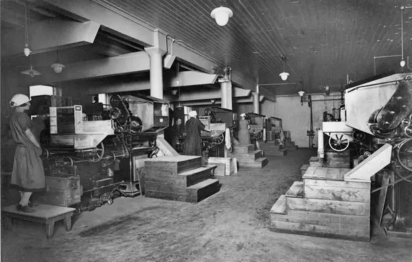 Produksjon av tobakk hos Tiedemanns Tobaksfabrik i Stensberggaten på 1930-tallet. Sigarettmaskiner.
