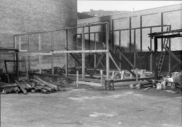 Tekst fra album: "Bedriftens snekkere samt kartonasjeavdelingen holdt til i kjelleretasjen i Falbesgt. Dette var i lengden uholdbart, og senhøstes 1953 gikk man inn for å rette på dette forholdet." "Byggetiden var 28 dager fra man startet." Foto fra byggearbeider foretatt ved J. L. Tiedemanns Tobaksfabrik fra sommeren 1951 frem til høsten 1955. Flere avdelinger arbeidet under mindre gode forhold, og det var mange problemer som måtte løses for å få tidsmessige og gode lagringsforhold. Foto fra Tiedemanns reklame- og tobakksmuseum. Samlingen består av gjenstander, fotografier og arkivalia knyttet til J. L. Tiedemanns Tobaksfabrik (etablert 1778). Fabrikken var en sentral og ledende aktør innen nærings- og nytelsesmiddelindustrien, og utgjør et langt og viktig kapittel i norsk industrihistorie. Tiedemanns Tobaksfabrik la ned produksjonen i 2008, etter 230 års virksomhet. Norsk Folkemuseum overtok Tiedemanns reklame- og tobakksmuseum i 2010.