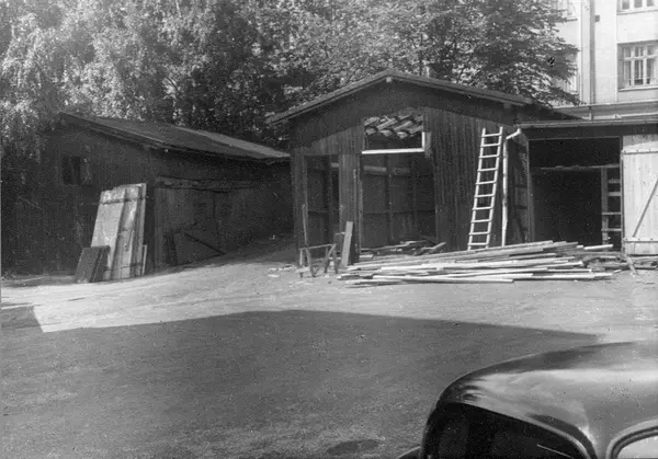 Gamle lagerskur på tomten til Holbergsgate 1 i 1954. Foto fra byggearbeider foretatt ved J. L. Tiedemanns Tobaksfabrik fra sommeren 1951 frem til høsten 1955.