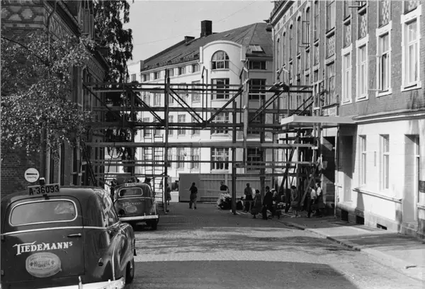 Tekst fra album: "I alle år har det vært et problem når arbeiderne i frokostpausen og etter endt arbeidstid skulde over gaten. Ideen fra Smedbraaten om en "sukkenes bro" over gaten ble derfor grepet med begjærlighet og kom til utførelse på kort tid." Foto fra byggearbeider foretatt ved J. L. Tiedemanns Tobaksfabrik fra sommeren 1951 frem til høsten 1955. Flere avdelinger arbeidet under mindre gode forhold, og det var mange problemer som måtte løses for å få tidsmessige og gode lagringsforhold. Foto fra Tiedemanns reklame- og tobakksmuseum. Samlingen består av gjenstander, fotografier og arkivalia knyttet til J. L. Tiedemanns Tobaksfabrik (etablert 1778). Fabrikken var en sentral og ledende aktør innen nærings- og nytelsesmiddelindustrien, og utgjør et langt og viktig kapittel i norsk industrihistorie. Tiedemanns Tobaksfabrik la ned produksjonen i 2008, etter 230 års virksomhet. Norsk Folkemuseum overtok Tiedemanns reklame- og tobakksmuseum i 2010.