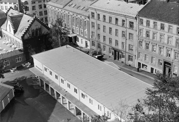 Tiedemanns Tobaksfabrik i Stensberggaten. Foto fra byggearbeider foretatt ved J. L. Tiedemanns Tobaksfabrik fra sommeren 1951 frem til høsten 1955.