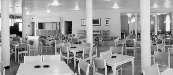 Interiør fra den nye spise- og forsamlingssal hos Tiedemanns Tobaksfabrik i Stensberggata i 1955. Foto fra byggearbeider foretatt ved J. L. Tiedemanns Tobaksfabrik fra sommeren 1951 frem til høsten 1955.
