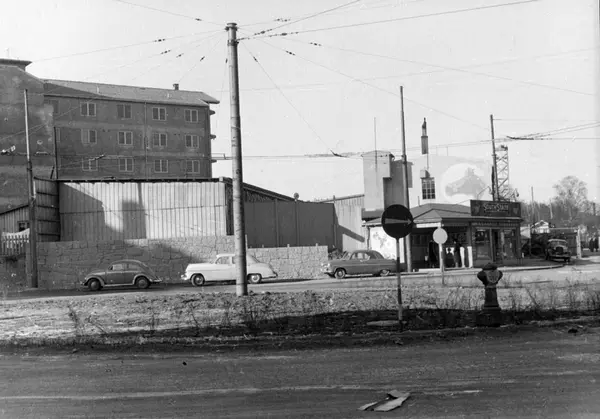 Lisa Christoffersens Plass med eskefabrikken i bakgrunnen. Foto fra byggearbeider foretatt ved J. L. Tiedemanns Tobaksfabrik fra sommeren 1951 frem til høsten 1955.