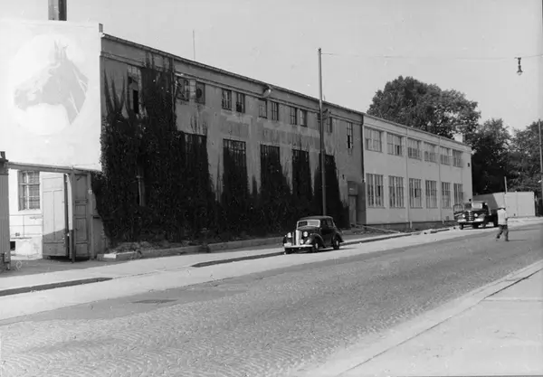 Tekst fra album: "Trange plassforhold gjennem mange år, samt problemet overgang til firkantesker nødvendiggjorde større plass på eskefabrikken. Fabrikken i Bergensgate må utvides, og i desember 1954 gikk man igang med å forlenge den gamle fabrikk med ca. 33m." Foto fra byggearbeider foretatt ved J. L. Tiedemanns Tobaksfabrik fra sommeren 1951 frem til høsten 1955. Flere avdelinger arbeidet under mindre gode forhold, og det var mange problemer som måtte løses for å få tidsmessige og gode lagringsforhold. Foto fra Tiedemanns reklame- og tobakksmuseum. Samlingen består av gjenstander, fotografier og arkivalia knyttet til J. L. Tiedemanns Tobaksfabrik (etablert 1778). Fabrikken var en sentral og ledende aktør innen nærings- og nytelsesmiddelindustrien, og utgjør et langt og viktig kapittel i norsk industrihistorie. Tiedemanns Tobaksfabrik la ned produksjonen i 2008, etter 230 års virksomhet. Norsk Folkemuseum overtok Tiedemanns reklame- og tobakksmuseum i 2010.