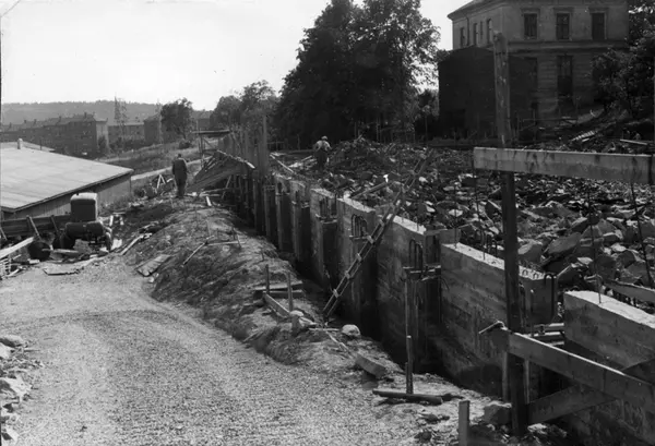 Østre langvegg og to gavler ferdigstøpt 19.06.1953. Konstruksjon av lagerbygning på Kampen i Oslo, Kampen III, i 1953.
