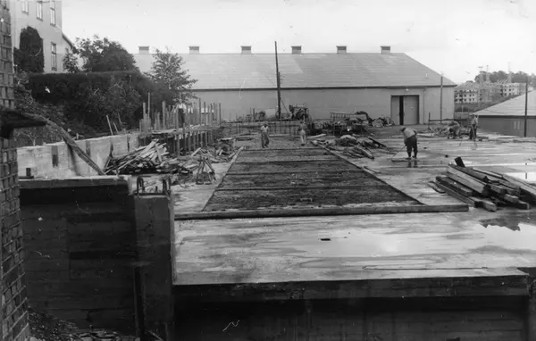 Støping av gulv. Konstruksjon av lagerbygning på Kampen i Oslo, Kampen III, i 1953.