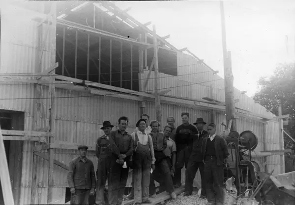 Gruppebilde. Konstruksjon av lagerbygning på Kampen i Oslo, Kampen III, i 1953.