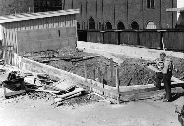 Bygging av ny kartonasjeavdeling hos Tiedemanns Tobaksfabrik i Stensberggate 1953.