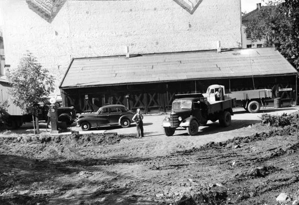 Konstruksjon av garasje og lager ved Tiedemanns Tobaksfabrik i Stensberggate i 1954.