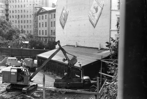 Konstruksjon av garasje og lager ved Tiedemanns Tobaksfabrik i Stensberggate i 1954.