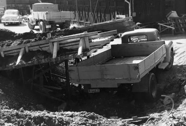 Konstruksjon av garasje og lager ved Tiedemanns Tobaksfabrik i Stensberggate i 1954.
