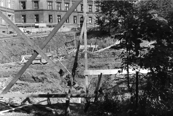 Konstruksjon av garasje og lager ved Tiedemanns Tobaksfabrik i Stensberggate i 1954.