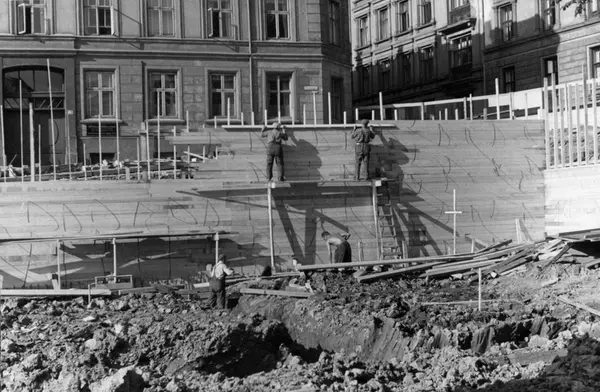 Konstruksjon av garasje og lager ved Tiedemanns Tobaksfabrik i Stensberggate i 1954.