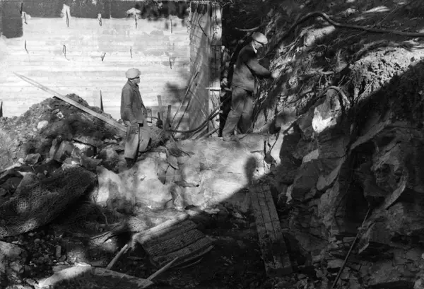 Konstruksjon av garasje og lager ved Tiedemanns Tobaksfabrik i Stensberggate i 1954.