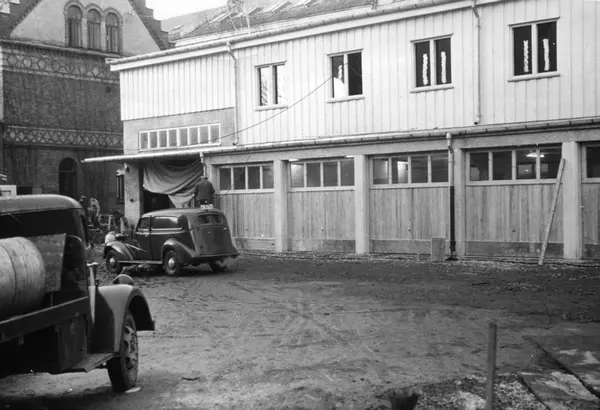 Konstruksjon av garasje og lager ved Tiedemanns Tobaksfabrik i Stensberggate i 1954. Varebilen er en Chevrolet årsmodell 1937-38.