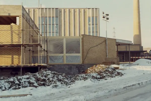 Byggeplass. Konstruksjon av Tiedemanns Tobaksfabrik på Hovin i 1969.