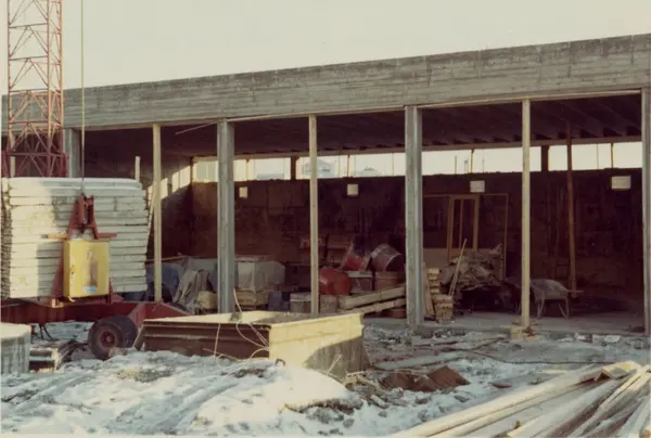 Byggeplass. Konstruksjon av Tiedemanns Tobaksfabrik på Hovin i 1969.