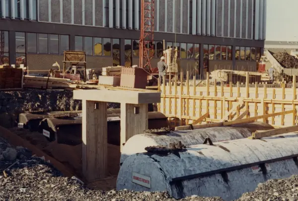 Byggeplass. Konstruksjon av Tiedemanns Tobaksfabrik på Hovin i 1969.