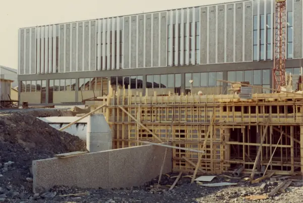 Byggeplass. Konstruksjon av Tiedemanns Tobaksfabrik på Hovin i 1969.