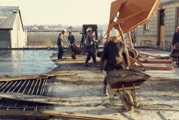Byggeplass. Konstruksjon av Tiedemanns Tobaksfabrik på Hovin i 1969.