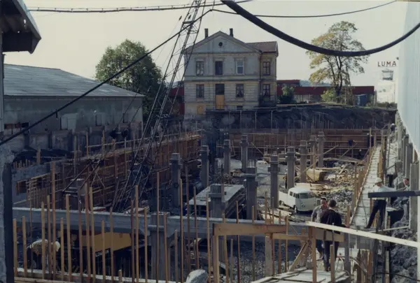 Byggeplass. Konstruksjon av Tiedemanns Tobaksfabrik på Hovin i 1969.