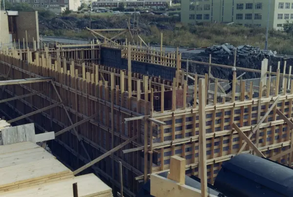 Byggeplass. Konstruksjon av Tiedemanns Tobaksfabrik på Hovin i 1969.