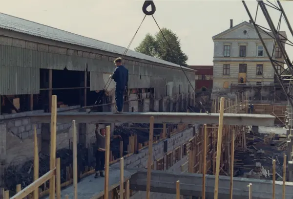 Byggeplass. Konstruksjon av Tiedemanns Tobaksfabrik på Hovin i 1969.