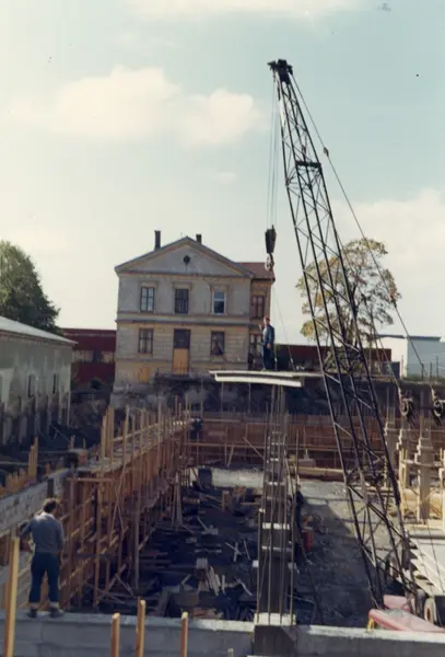 Byggeplass. Konstruksjon av Tiedemanns Tobaksfabrik på Hovin i 1969. En kran heiser opp bygningsmaterialer og en bygningsarbeider.