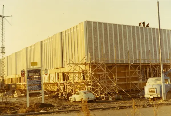 Byggeplass. Konstruksjon av Tiedemanns Tobaksfabrik på Hovin i 1969.