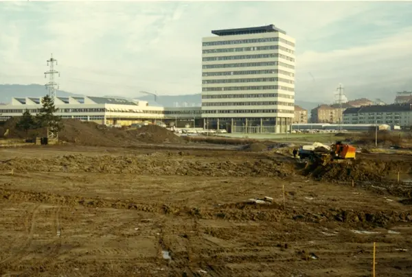 Byggeplass. Konstruksjon av Tiedemanns Tobaksfabrik på Hovin i 1966.