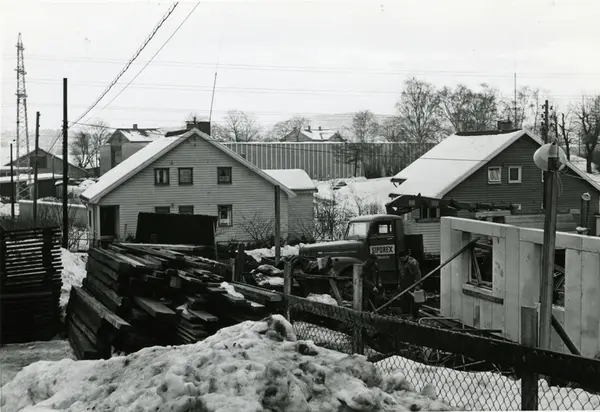 Byggeplass. Konstruksjon av Tiedemanns Tobaksfabrik på Hovin i 1967. Fotografiet viser også noen eneboliger ved siden av byggeplassen.