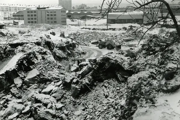 Byggeplass. Konstruksjon av Tiedemanns Tobaksfabrik på Hovin i 1967.