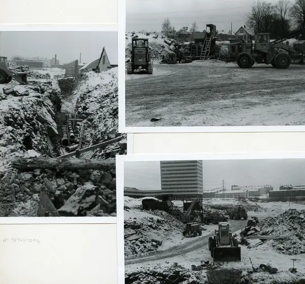 Byggeplass. Konstruksjon av Tiedemanns Tobaksfabrik på Hovin i 1967. Et montasje av tre fotografier som viser gravemaskiner i arbeid på byggeplassen.