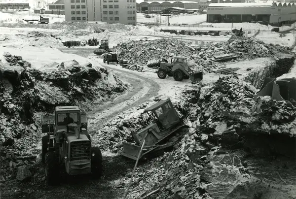 Byggeplass. Konstruksjon av Tiedemanns Tobaksfabrik på Hovin i 1967. Gravemaskiner i arbeid på byggeplassen.