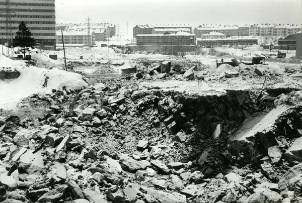 Byggeplass. Konstruksjon av Tiedemanns Tobaksfabrik på Hovin i 1967.