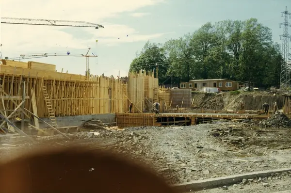 Byggeplass. Konstruksjon av Tiedemanns Tobaksfabrik på Hovin i 1967.