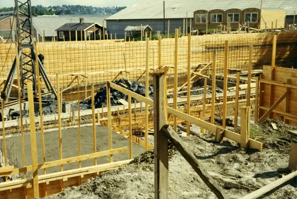 Byggeplass. Konstruksjon av Tiedemanns Tobaksfabrik på Hovin i 1967.