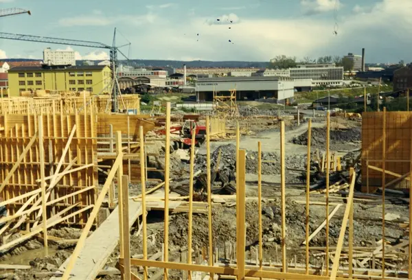 Byggeplass. Konstruksjon av Tiedemanns Tobaksfabrik på Hovin i 1967.
