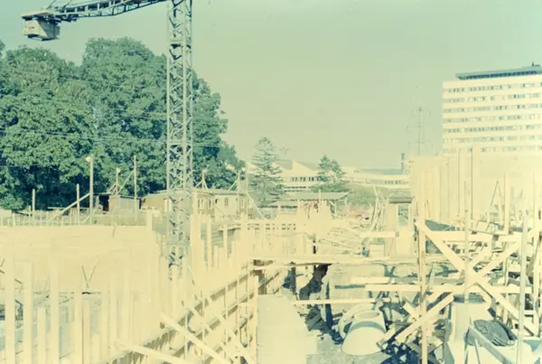 Byggeplass. Konstruksjon av Tiedemanns Tobaksfabrik på Hovin i 1967.