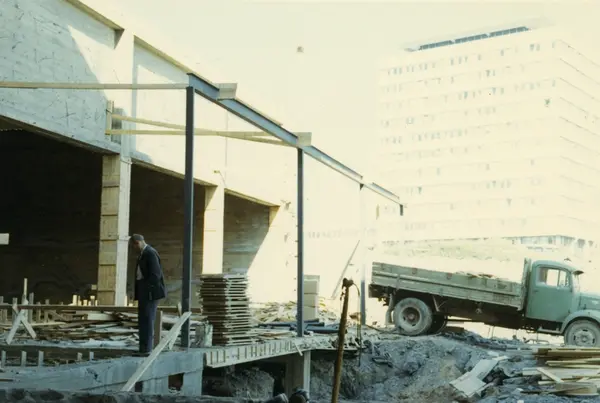 Byggeplass. Konstruksjon av Tiedemanns Tobaksfabrik på Hovin i 1967.